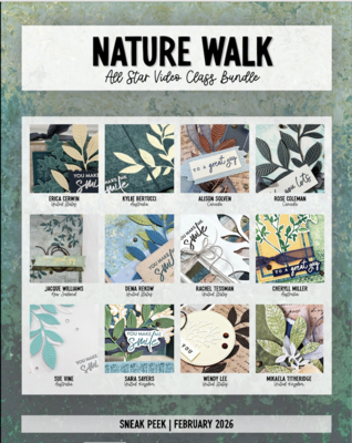 Twelve projects, each designed by a differnt Stampin' Up Demo, featureing the Nature Walk suite. The PDF includes measurements and supplies as well as a link to each video.